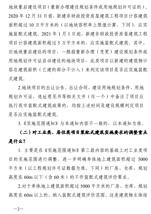 2020年12月31日前,新建非財(cái)政投資房屋建筑工程項(xiàng)目計(jì)容建筑面積超過(guò)10萬(wàn)平方米的(以地塊容積率上限值計(jì)算,下同),應(yīng)實(shí)施裝配式建筑。2021年1月1日起,新建非財(cái)政投資房屋建筑工程項(xiàng)目計(jì)容建筑面積超過(guò)5萬(wàn)平方米的,應(yīng)實(shí)施裝配式建筑。
