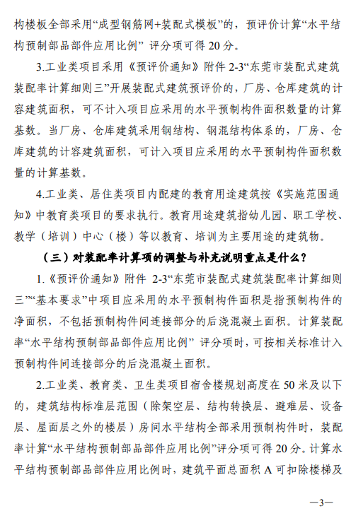 工業(yè)類項(xiàng)目采用《關(guān)于開(kāi)展裝配式建筑項(xiàng)目預(yù)評(píng)價(jià)工作的通知》(以下簡(jiǎn)稱《預(yù)評(píng)價(jià)通知》)附件2-3“東莞市裝配式建筑裝配率計(jì)算細(xì)則三”開(kāi)展裝配式建筑預(yù)評(píng)價(jià)的,廠房、倉(cāng)庫(kù)建筑的計(jì)容建筑面積,可不計(jì)入項(xiàng)目應(yīng)采用的水平預(yù)制構(gòu)件面積數(shù)量的計(jì)算基數(shù)。當(dāng)廠房、倉(cāng)庫(kù)建筑采用鋼結(jié)構(gòu)、鋼混結(jié)構(gòu)體系的,廠房、倉(cāng)庫(kù)建筑的計(jì)容建筑面積,可計(jì)入項(xiàng)目應(yīng)采用的水平預(yù)制構(gòu)件面積數(shù)量的計(jì)算基數(shù)。