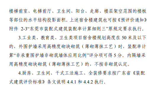 該通知對(duì)裝配率計(jì)算項(xiàng)的調(diào)整與補(bǔ)充進(jìn)行解釋說(shuō)明?!额A(yù)評(píng)價(jià)通知》附件2-3“東莞市裝配式建筑裝配率計(jì)算細(xì)則三”“基本要求”中項(xiàng)目應(yīng)采用的水平預(yù)制構(gòu)件面積是指預(yù)制構(gòu)件的凈面積,不包括預(yù)制構(gòu)件間連接部分的后澆混凝土面積。計(jì)算裝配率“水平結(jié)構(gòu)預(yù)制部品部件應(yīng)用比例”評(píng)分項(xiàng)時(shí),可按相關(guān)標(biāo)準(zhǔn)計(jì)入預(yù)制構(gòu)件間連接部分的后澆混凝土面積。